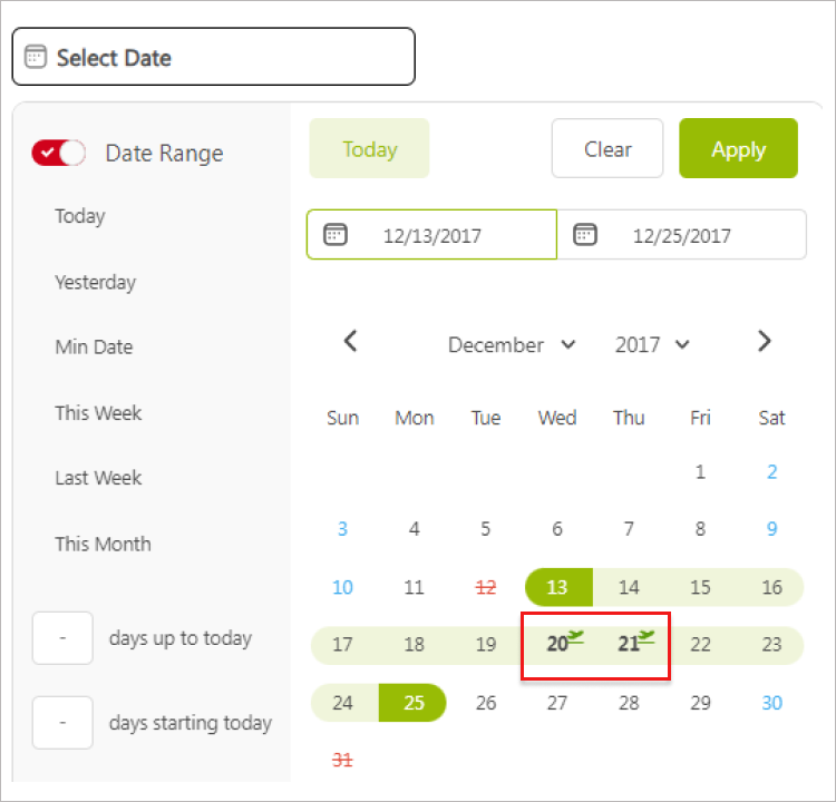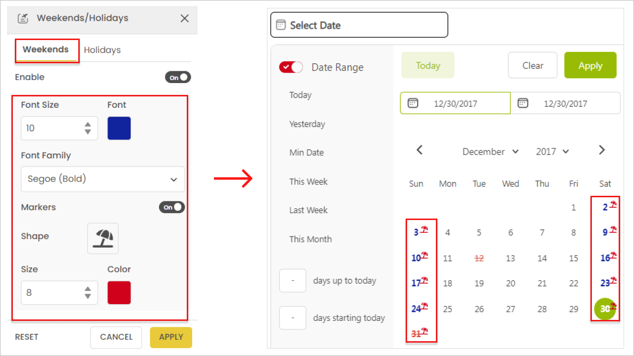 You can also choose to show icons on weekend dates. Simply enable the marker and select the icon shape, color, and size.