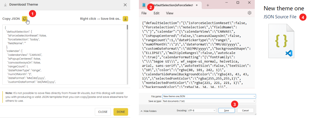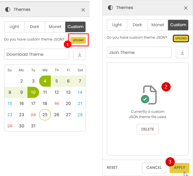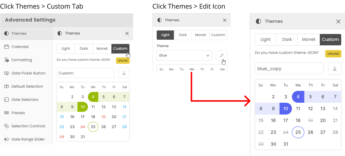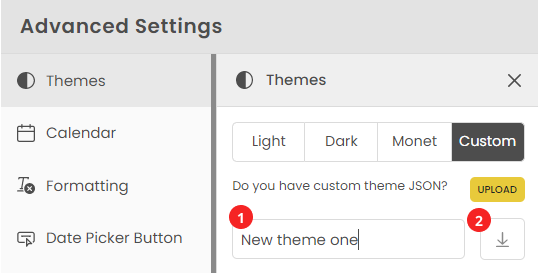 You can save all your formatting and functionality changes in a custom theme. This is where you can upload and download themes specifically designed for the date picker.
