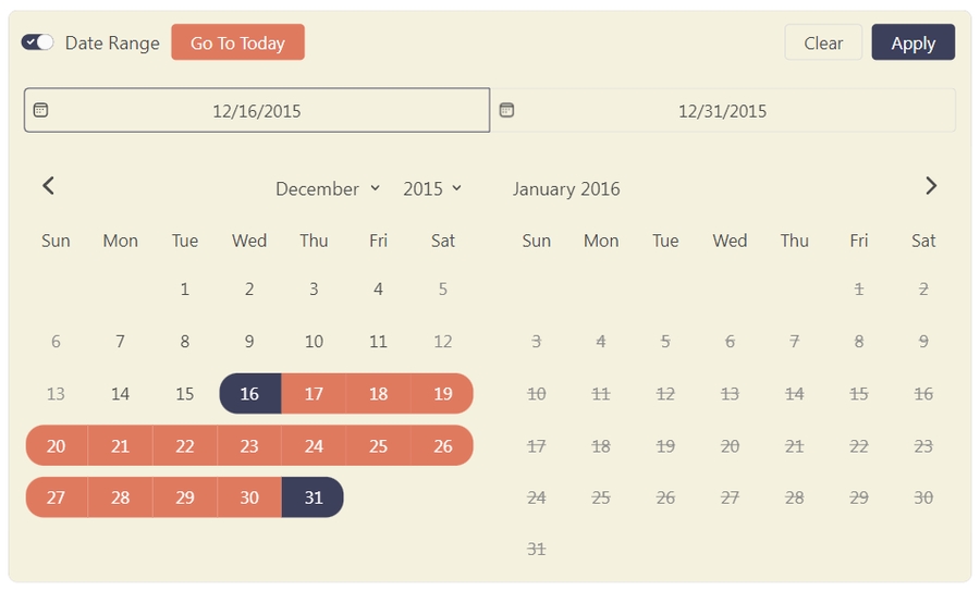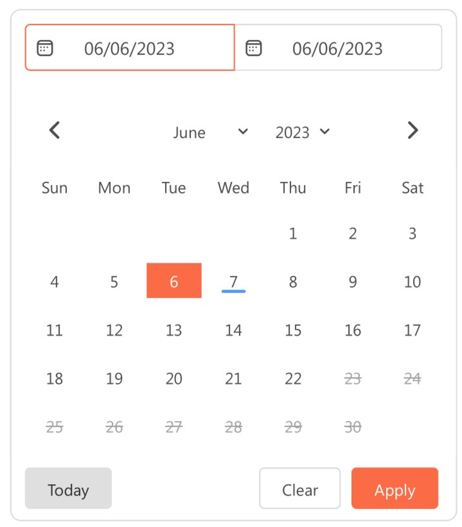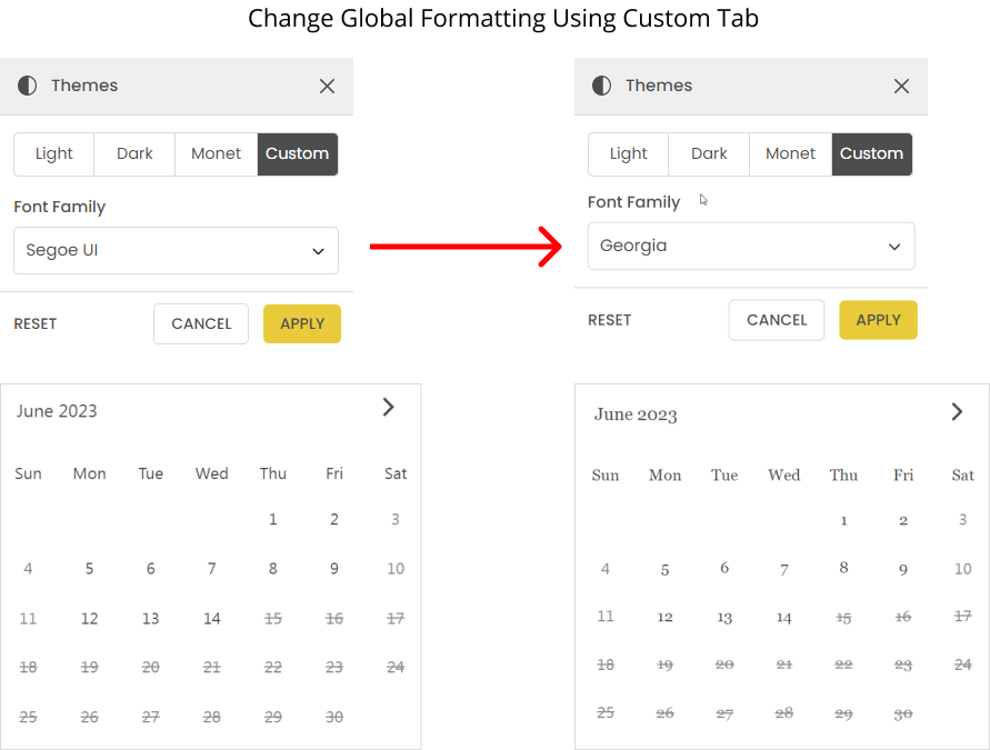 In global styling, You can modify the fundamental colors and font families simultaneously. This mode remains unaffected by any functionality changes, such as disabling presets or selecting a single-month calendar. The moment you change the colors and font family in any other options, it will trigger the full customization view.