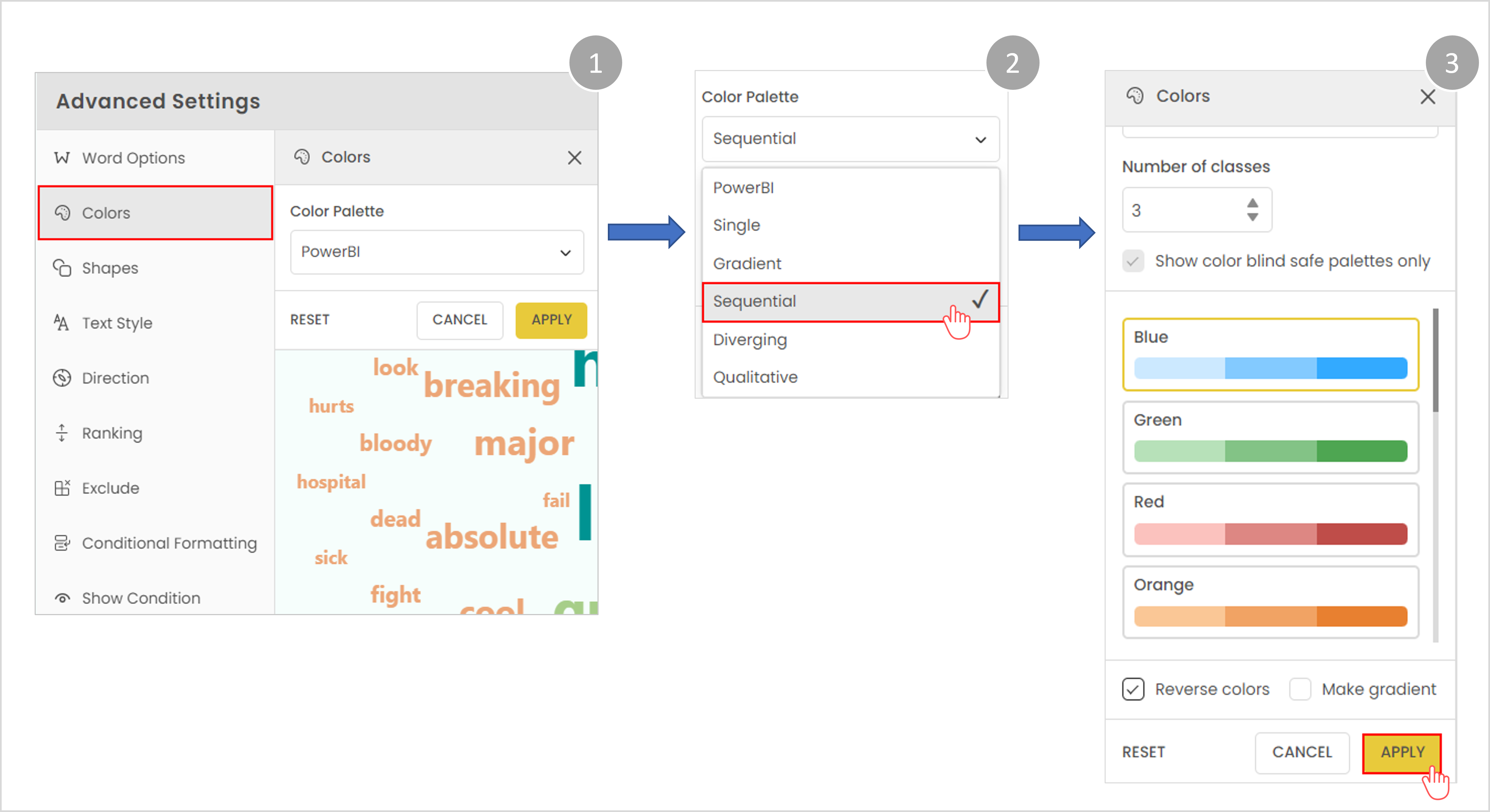 By default, Show color blind safe palette is on, therefore in sequential, all the colors are color blind safe.