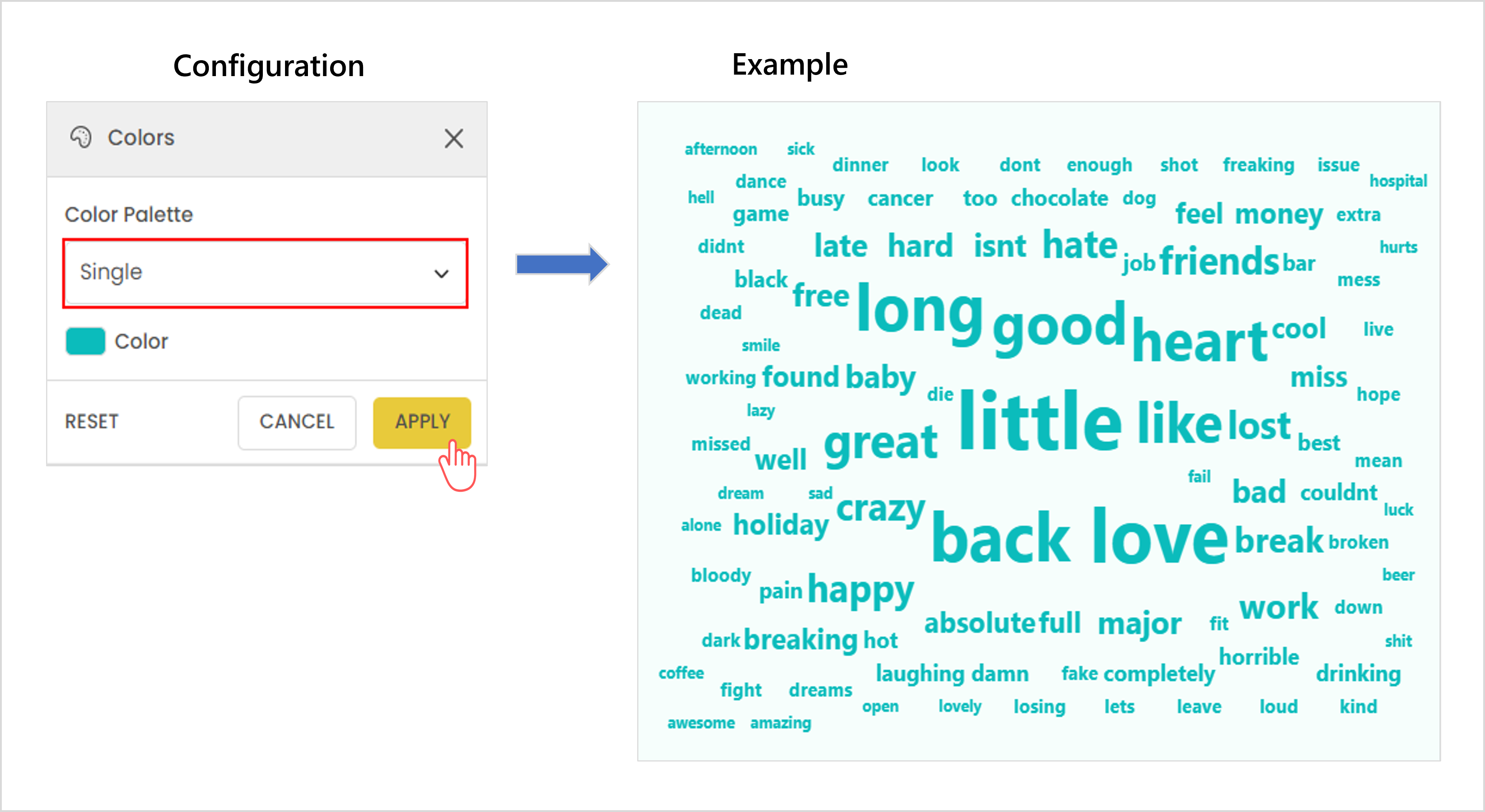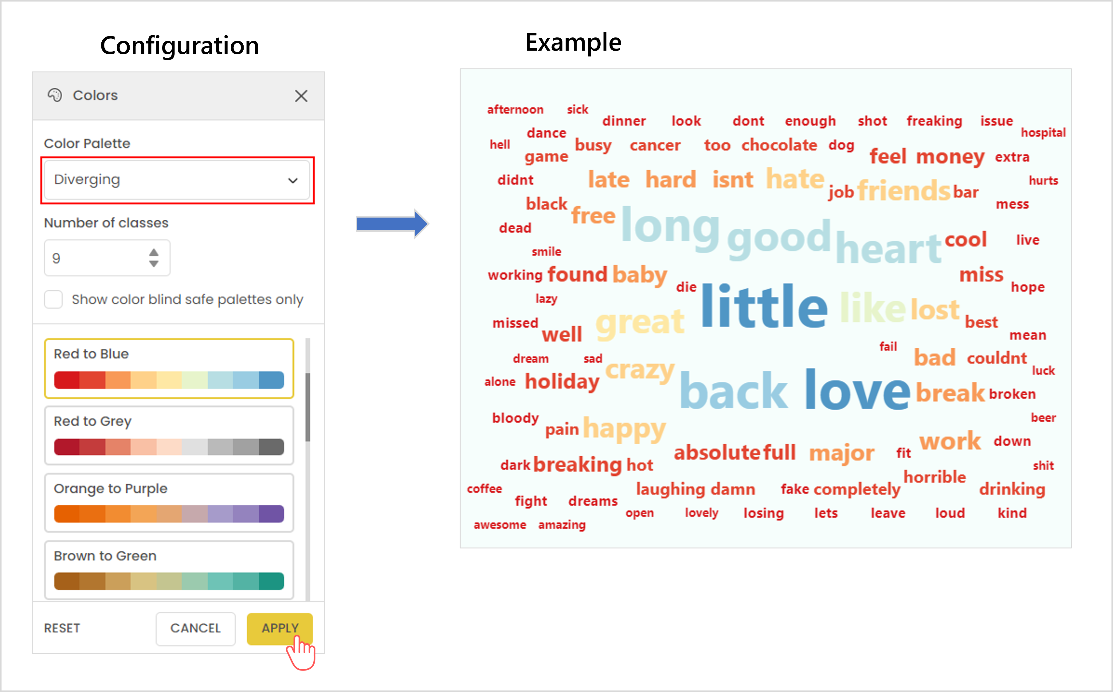 The gradient scheme colors each word based on its value. You can customize the palette by choosing a max color for the highest value and a min color for the lowest value.